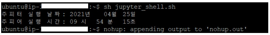 이후 esc + : 버튼을 통해 저장 여부를 확인하고 wq(write quit: 저장후 종료) 입력하고 enter을 통해 빠져준다. 이제 다음의 코드를 실행만 하면 번거롭게 주피터노트북을 실행하지않아도 쉘 스크립트를통해 실행 할 수 있다. 이제 쉘 스크립트를 실행하면 쉘 스크립트 안에 주피터 실행 날짜와 실행시간이 나타는것을 확인 할 수 있다.